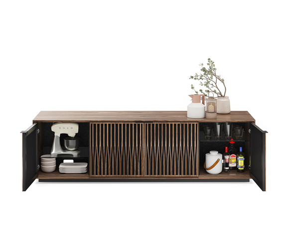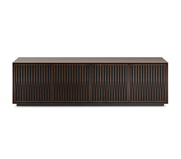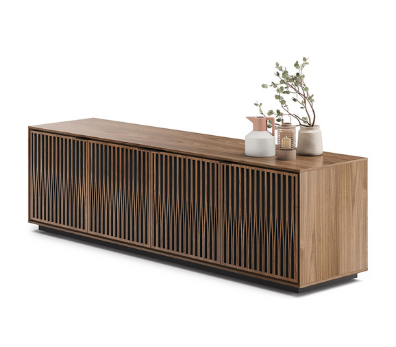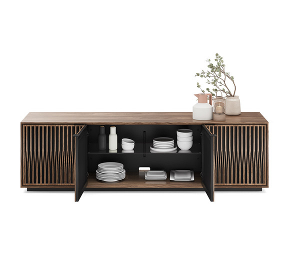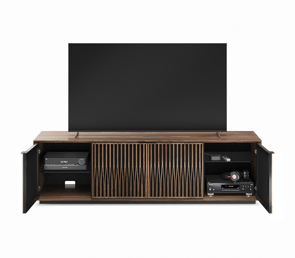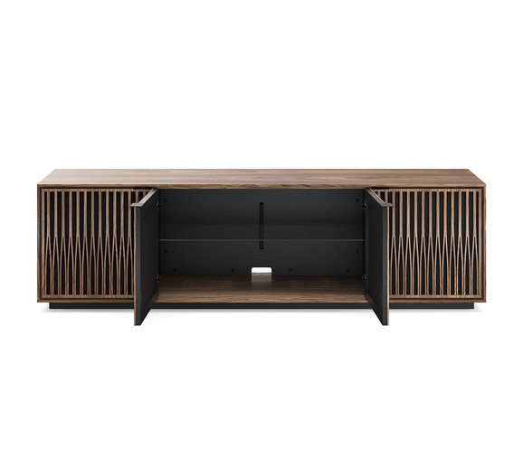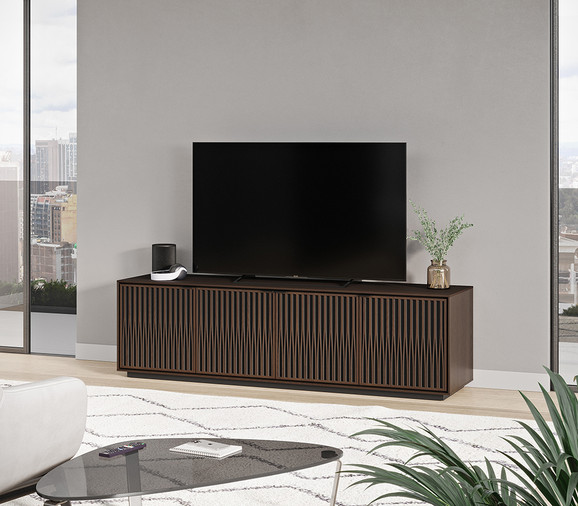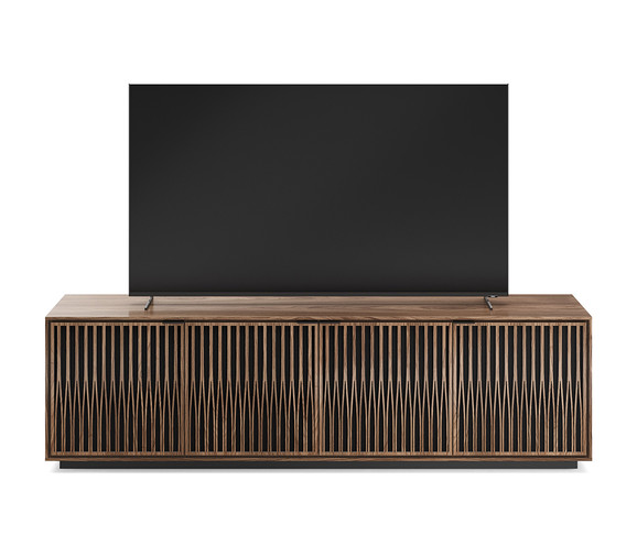 Elements Tune pairs its sound-wave door pattern with a low, modern rolling base for a grounded profile that suits larger TVs or streamlined storage. The acoustically transparent design allows for clear audio and remote access while concealing components behind its distinctive doors. Hidden wheels provide effortless access, and adjustable shelving adapts as your setup evolves. Tune’s quiet, graphic pattern and low stance bring a contemporary balance of form and function to any media space. See more of the BDI Elements Collection.