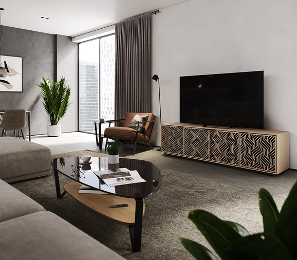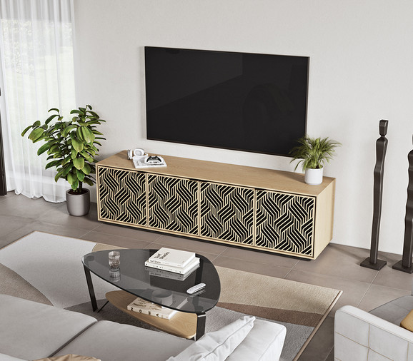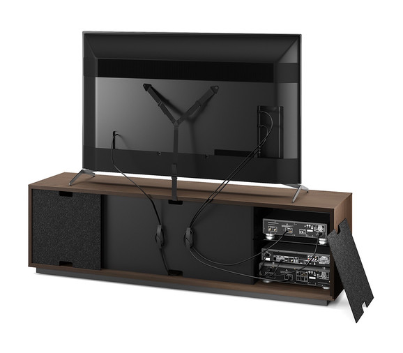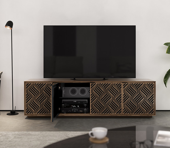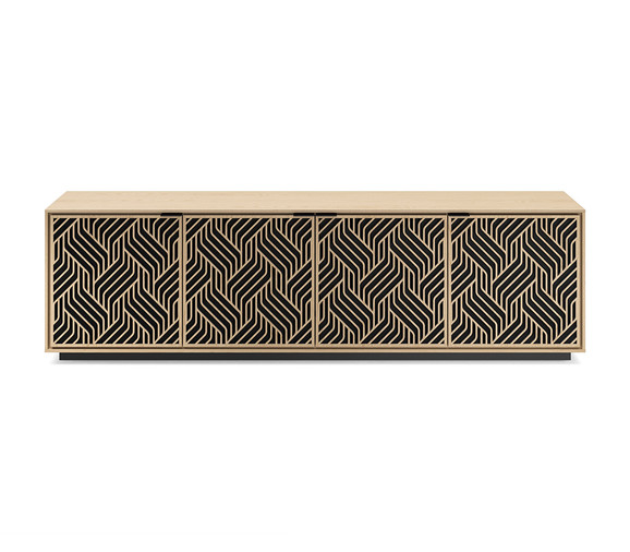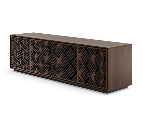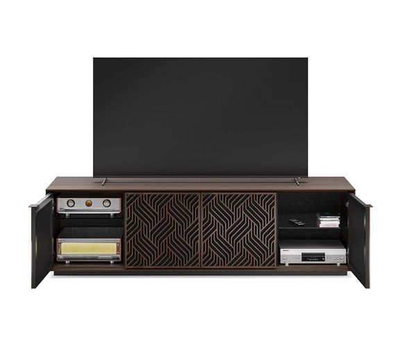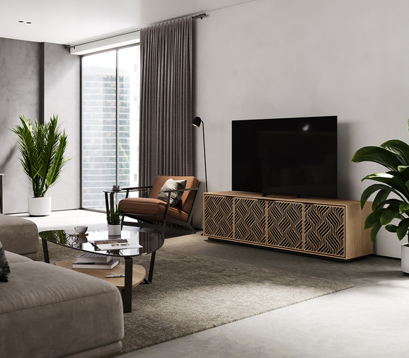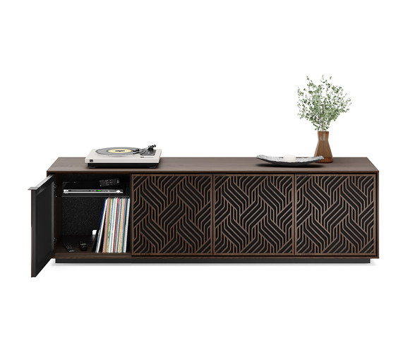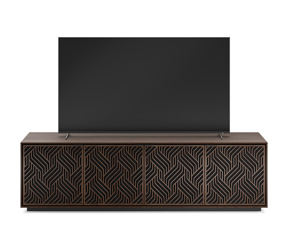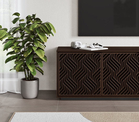 Elements Weave combines its warm, woven-inspired door pattern with the collection’s low rolling base for a relaxed, contemporary feel. The doors are acoustically transparent, keeping speakers and components hidden while maintaining full performance and remote clarity. Hidden wheels and internal levelers make access easy, and adjustable shelves offer adaptable storage for media or décor. The result is a grounded, textural cabinet that adds calm sophistication to any room. See more of the BDI Elements Collection.