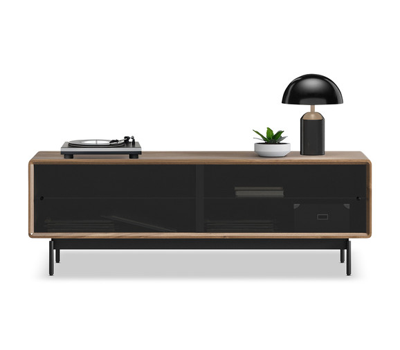 The LINQ 65" Low Console brings the collection’s signature curves and warm materials into a sleek, low-profile media piece. Grey-tinted glass doors slide smoothly across the front, keeping components discreet while allowing full remote access. The rounded hardwood frame softens the silhouette, giving the console a refined presence whether placed beneath a TV or used as a streamlined storage piece in any room. Behind the clean façade, adjustable shelving and thoughtful cable management keep everything organized and out of sight. Modern, compact, and quietly sophisticated, the Low Console extends LINQ’s design language with effortless function. See more of the BDI Linq Collection.