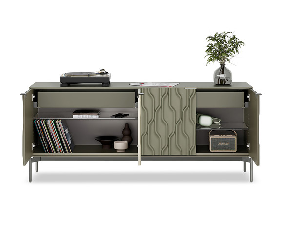 Combining the fluidity of carved doors with a stark rectilinear form, Mesa is not your ordinary storage console. Whether anchoring an entryway or serving as a sideboard or credenza, Mesa provides refined storage with show-stopping style. The interior is fully configurable to meet a diverse range of needs. The shelves and drawers can be repositioned to create a customized storage solution.