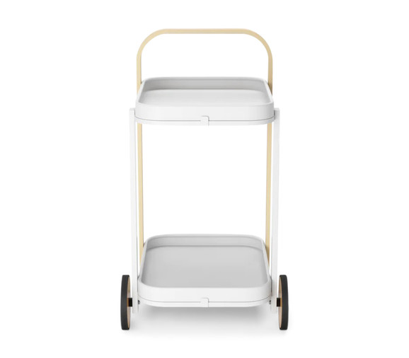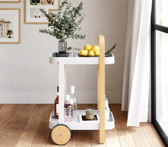 A modern, two-toned wooden bar cart, Bellwood bar and serving cart makes the perfect addition to any corner of your home. Create your own at-home bar setup or use Bellwood to make an indoor garden cart or side table. Bellwood's rubber-rimmed wheels, make it easy to move around or remove a tray to help you serve on the go or clean. With two tiers, there is plenty of space to add your bar tools and accessories, stemware, decor and more. The versatile cart is part of the Bellwood collection that includes coffee table, end table, wall and standing storage shelfs.
