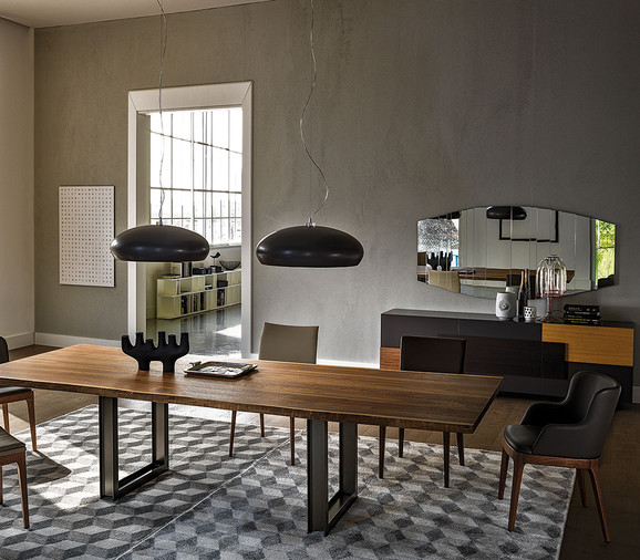 The Sigma dining table brings sculptural simplicity to the modern dining room. Its wood top showcases natural, irregular edges that highlight the beauty of the grain and give the piece an organic, hand-crafted presence. Two geometric metal bases support the top with a striking architectural balance; positioned parallel or perpendicular, they create subtly different looks while maintaining the table’s crisp, minimalist silhouette. Refined, substantial, and rich in material detail, Sigma becomes a centerpiece that anchors the room with warmth and modern character.