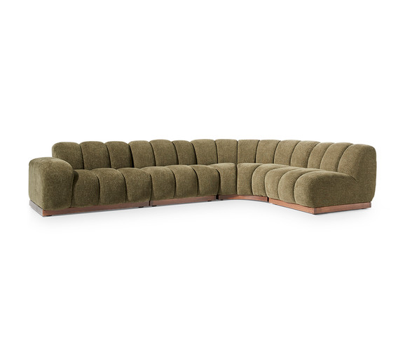 Auren’s sculpted curves and wide channel tufting bring bold personality to this streamlined four-piece design. With its armless profile, the look feels open and versatile, perfect for modern spaces that invite flexible seating. Resting on a walnut wood base, it pairs retro influence with contemporary ease — all while delivering the same lounge-ready comfort Auren is known for. See more of the Auren Collection.