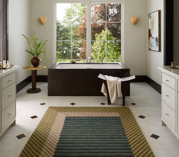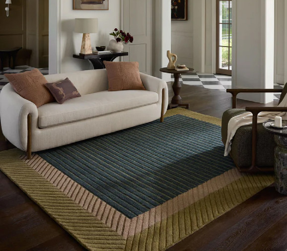 Dimension brings sculptural texture to the floor, pairing carved linear details with a bold, color-blocked frame. The interplay of deep blue, soft blush, and earthy olive creates a modern palette that feels both grounded and elevated. With its architectural border and plush, rhythmic surface, Dimension adds structure, warmth, and quiet sophistication to contemporary spaces.